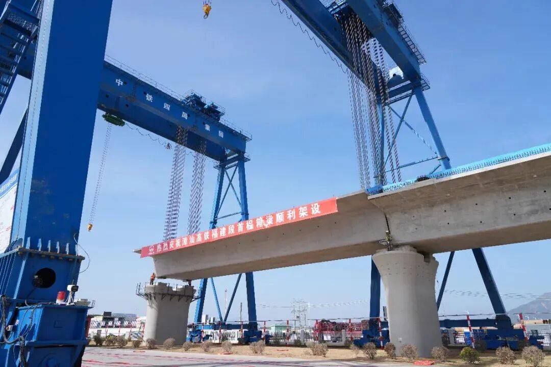 漳汕高铁福建段是国家“八纵八横”高速铁路网沿海通道的重要组成部分, 线路起自福厦高铁漳州站,经福建省漳州市,广东省潮州市、汕头市,接入汕头站,**设7座车站,线路全长约175公里,设计时速350公里。中铁四局承建的3标管段全长27.173公里,主要包括路基、桥梁、隧道、箱梁制架等施工内容。此次架设的漳汕高铁东山跨海特大桥全长20.262公里,为漳汕高铁福建段最长桥梁,项目承担其中9.5公里施工任务。